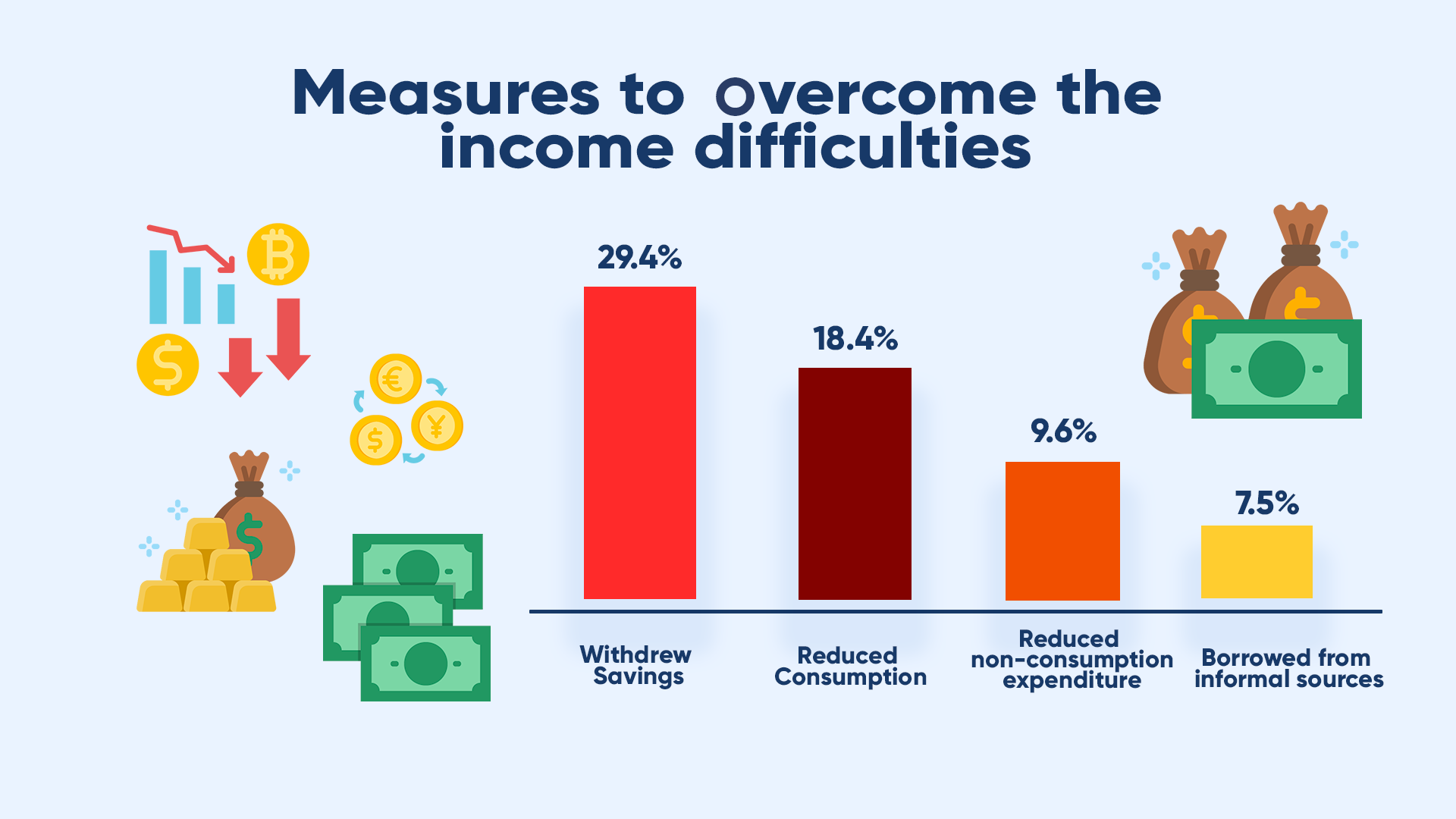 Most of the people have withdrew their savings to overcome income reduction while others reduced the consumption and other expenditures